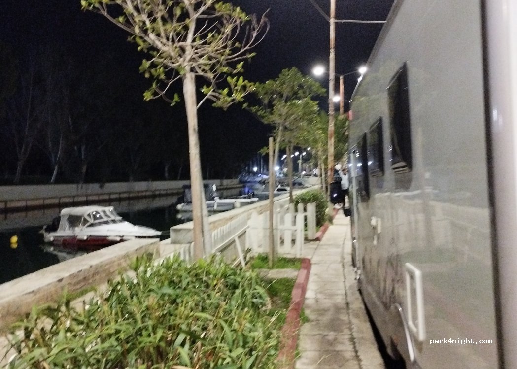 We spent a quiet night here after a great and exhausting day in Athens. The surroundings are well-kept, restaurants to the right and a marina to the left. Parking on the side of the road, little traffic.