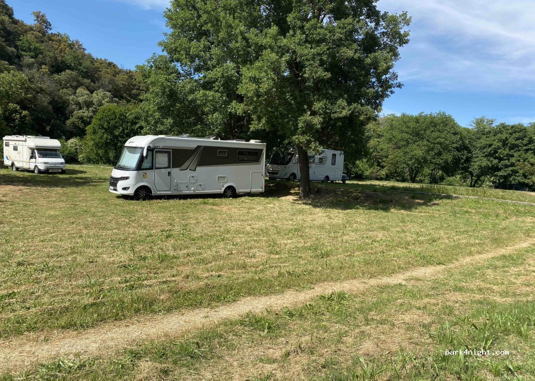 C'est uniquement un parking avec point de vidange, le parking nuit est indiqué a1. 5 km sur la D14 en sortant du village. Un grand champ avec ombre.