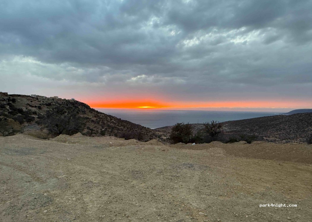 Un terrain de gravier relativement plat au bord de la route, juste en dessous du village d'Azazoul. Pas de bruit car la route est très calme avec peu de circulation. Coucher de soleil spectaculaire. La région est magnifique pour courir sur route. Un peu plus loin, il y a une route de gravier de 5 km de long jusqu'à Imi Ouaddar. Il y a une couverture mobile mais au moment de la visite, elle est assez basique.