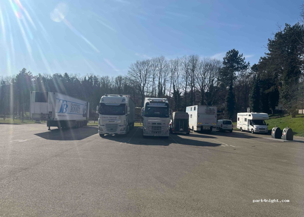 Tarmac parking opposite the paid motorhome park and next to the swimming pool car park. Flat terrain. HGVs park there on weekends and people park there all year round in their converted trucks. Very quiet location. Walk around the Grobon pond where you can fish. The Châtillon market is great, very varied and voted 3rd best market in France on TF1.