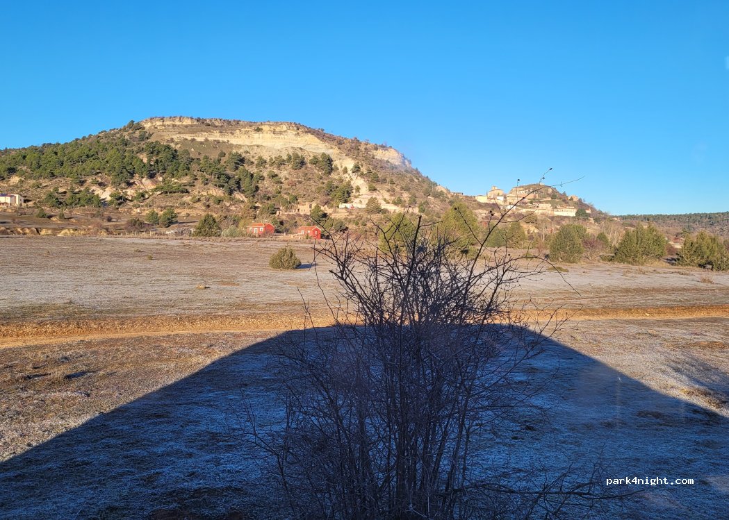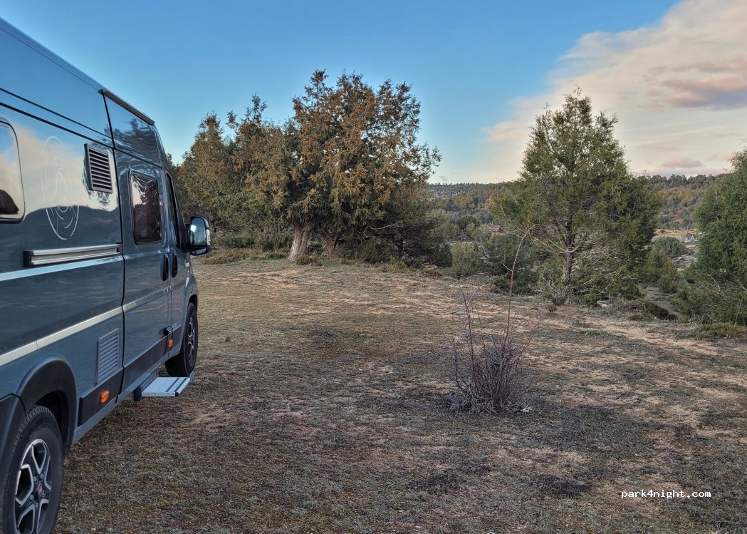 c'est un peu loin de Cuenca mais on est tranquille et suffisemment loin de la route. On a pris le chemin de terre à gauche et on s'est posé un peu plus loin pour ne pas être vu de la route. Terrain plat convenant pour tout type de véhicule. Attention à la route si vous venez de Cuenca car ville difficile à traverser avec gros véhicule. Emplacement parfait après les fortes chaleurs.