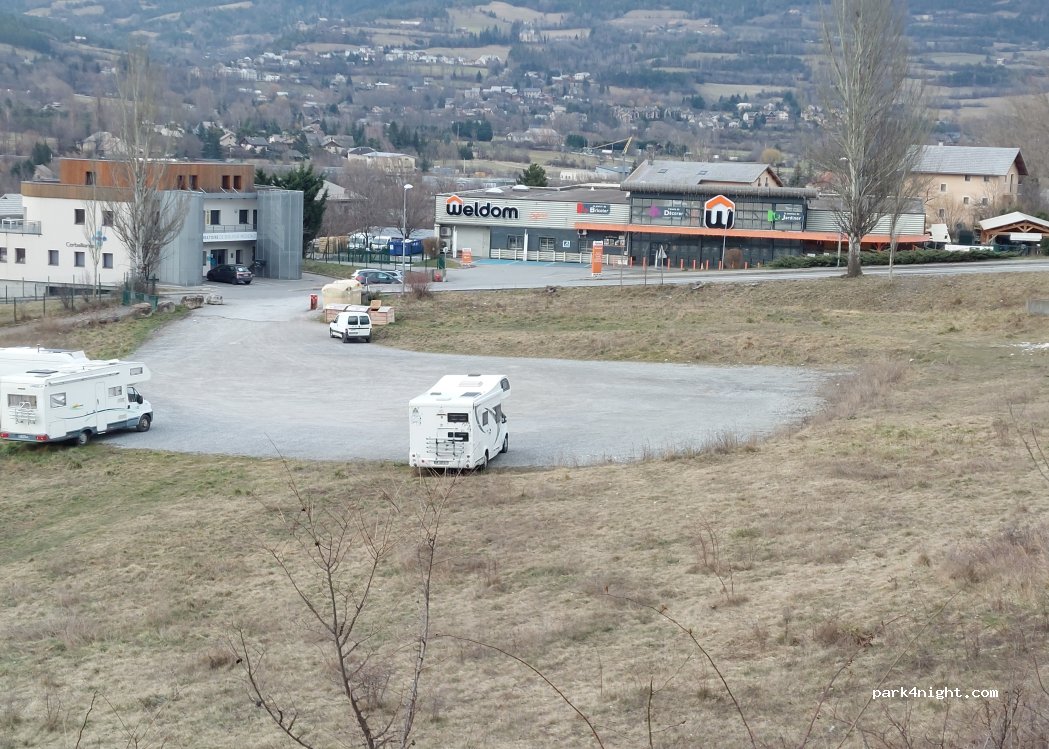 Parking gratuit en face de Weldom. A 1 km du plan d'eau d'Embrun et à 900 m de Super U et à 1300m du centre d Embrun