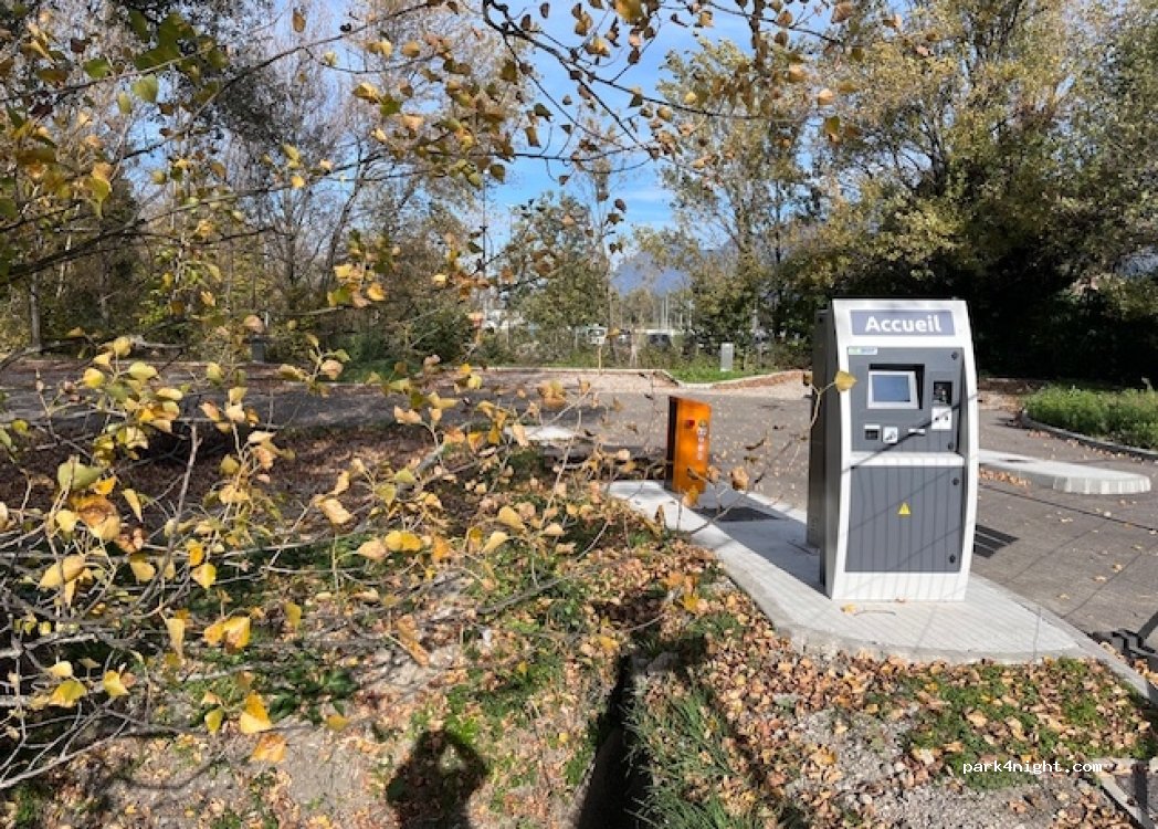 Aire réouverte - Tout y est - Borne de service avec vidange innovante et facile à utiliser sans se salire !! - connecteur d'életricité à chacune des places - Bravo et merci à Sassenage pour ce très bel espace calme -