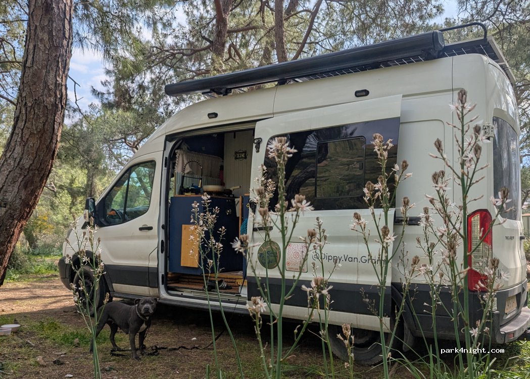 Parking du sentier côtier. L'endroit n'a rien de spécial, mais nous y avons passé une nuit tranquille en février. A proximité des flammes de la chimère.