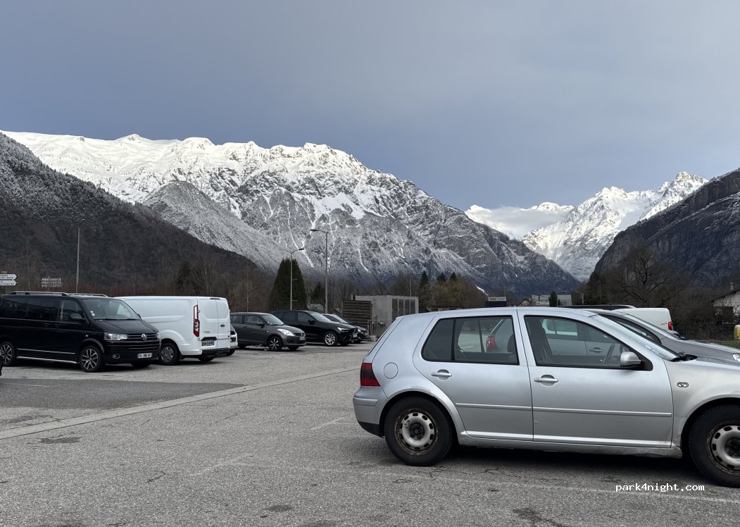 a priori pratique,nous avons vite été déçus par ce lieu ou la circulation est abondante et bruyante .Situé aux abords d'un rond point déservant les stations et le bourg d'oisans.Un parking qui n'a rien d'une aire de camping car.