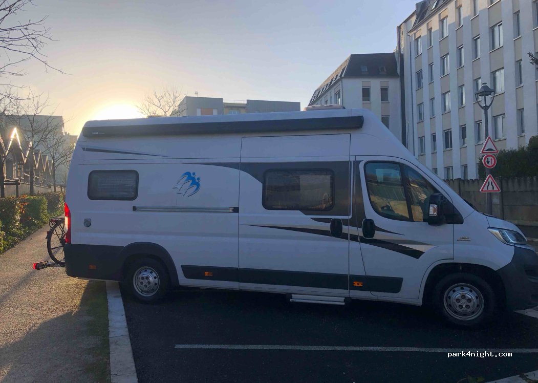 Marked parking spaces on the side of the road. Arrived around 7 p.m. I parked my 6.30 m long Fiat Ducato at a slight angle. The bike rack protruded a little into the sidewalk. Had a quiet night, even though the space is in a residential area. In the morning I moved to a free parking lot on the Loire, as it was not clear whether the parking lot was monitored.