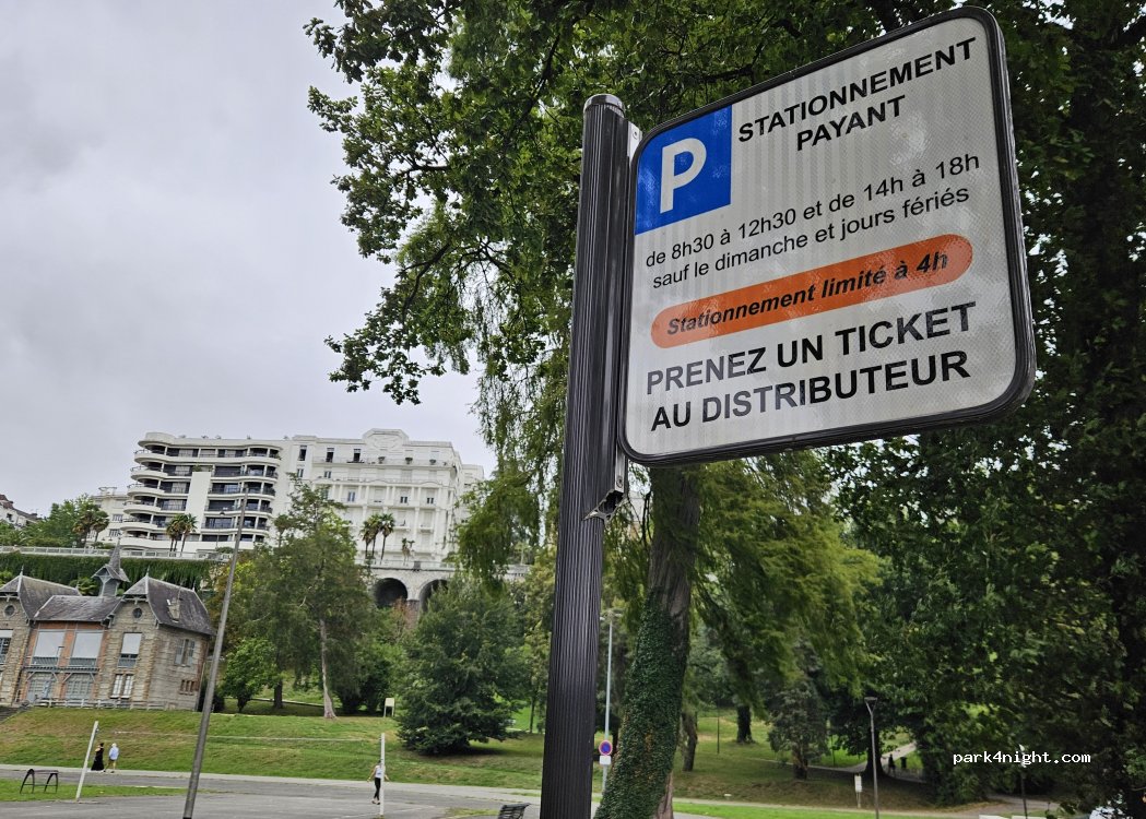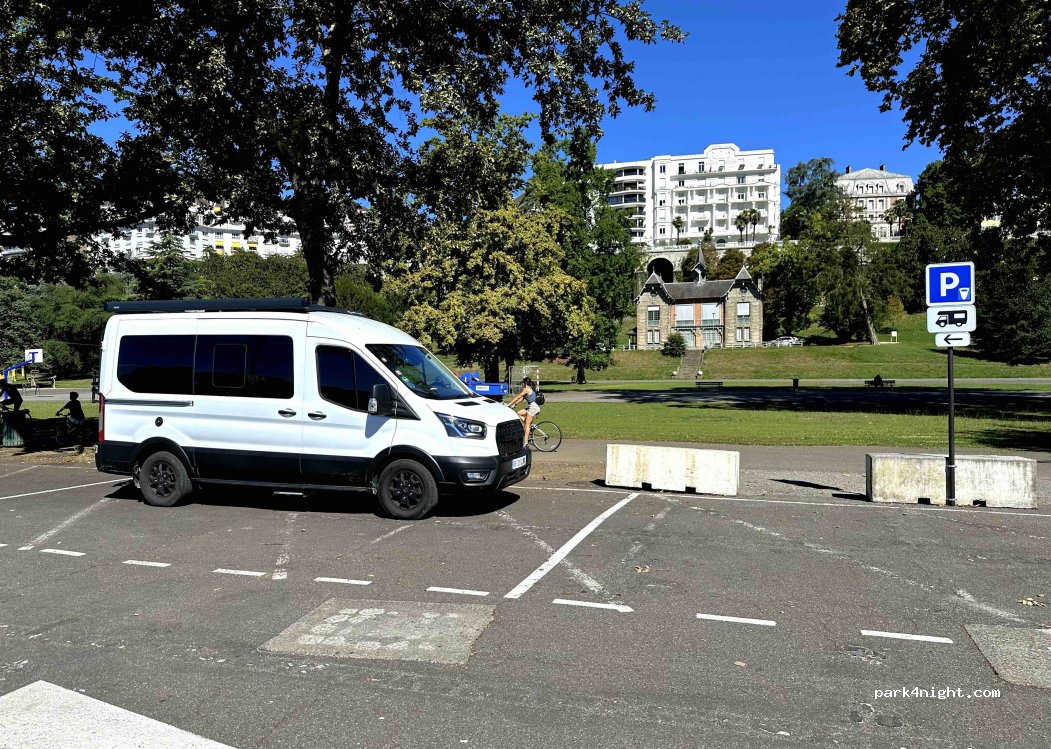 A día de hoy se puede pernoctar(confirmado en oficina de turismo) Gratis hasta las 8:30, despuéshay que pagar(app movil) De día max 4h Localización perfecta para visitar Pau al pie del funicular(gratis)historico que sube a la ciudad De un lado hay una pista atletismo,futbol,basket,gym,parque infantil y wc publicos gratuitos Del otro lado,una calle ancha,no nos molestó demasiado el ruido