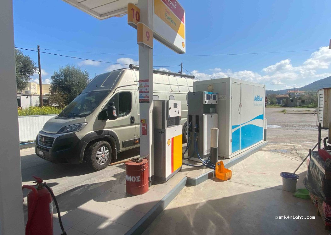 Tankstelle mit AD-Blue Zapfsäule. Grosses Gelände. Gute Zu-und Wegfahrt. Es hat eine Toilette im Shop. Grosse Waschhalle mit Grube, man muss jedoch fragen.