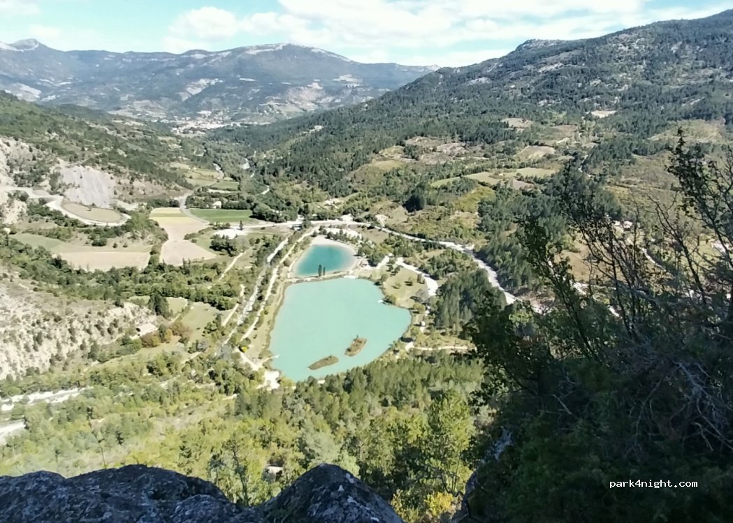 Cadre calme et magnifique au bord de deux lacs, pêche et baignade.parking payant 7 euros la nuit. Possibilite remplissage eau propre et vidange k7. Possibilité d'aller à la Motte Chalancon par un chemin goudronné puis sentier, départ du pont en face le lac, 1h20 aller/retour, 6km facile.