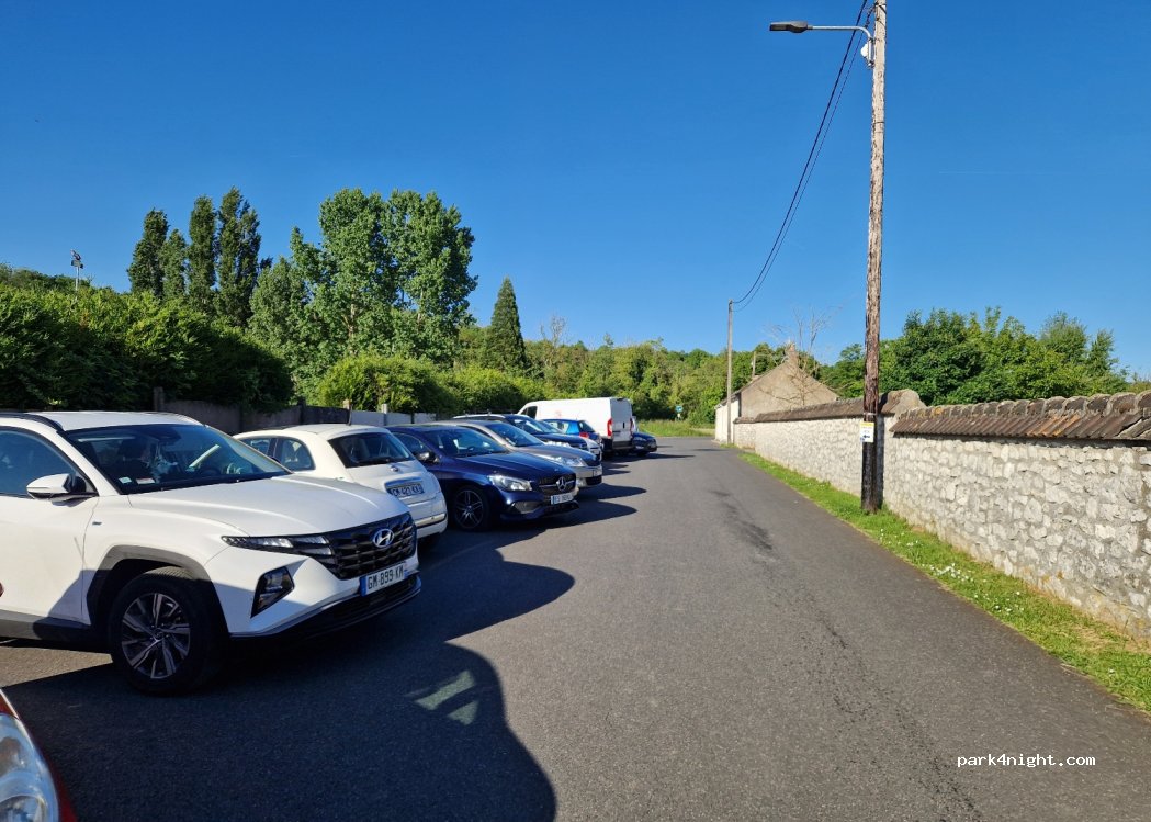 Parking en épi à côté du stade et des terrains de tennis. Canal a côté. Boulangerie au niveau du pont (5min à pieds) le long du canal. Accès je pense difficile pour les gros camping cars. Pour y accéder : longer le canal. Éviter l'autre côté qui est bien trop serré.