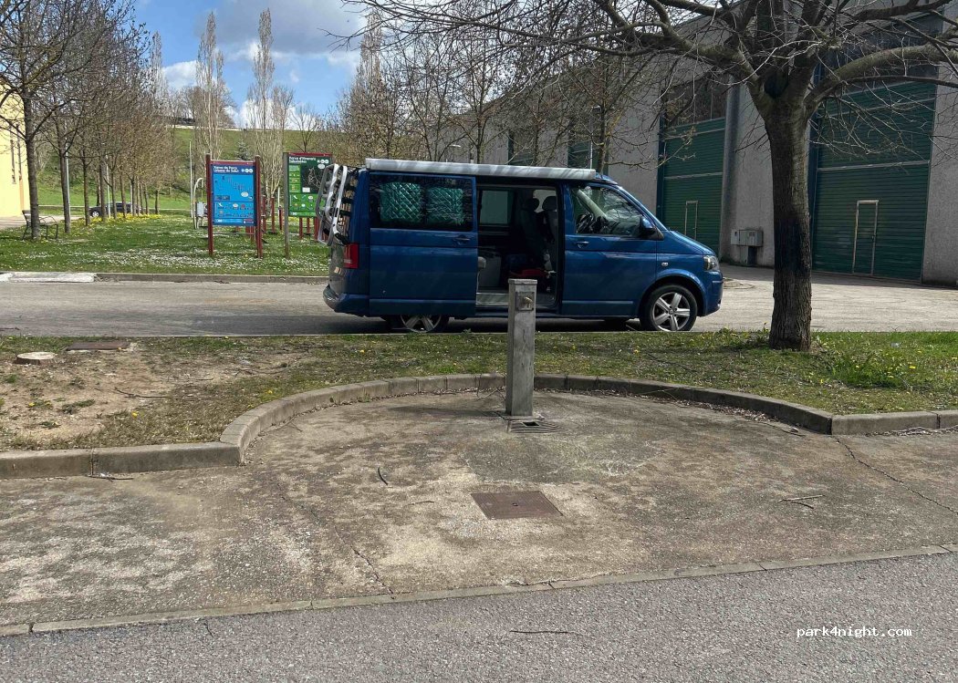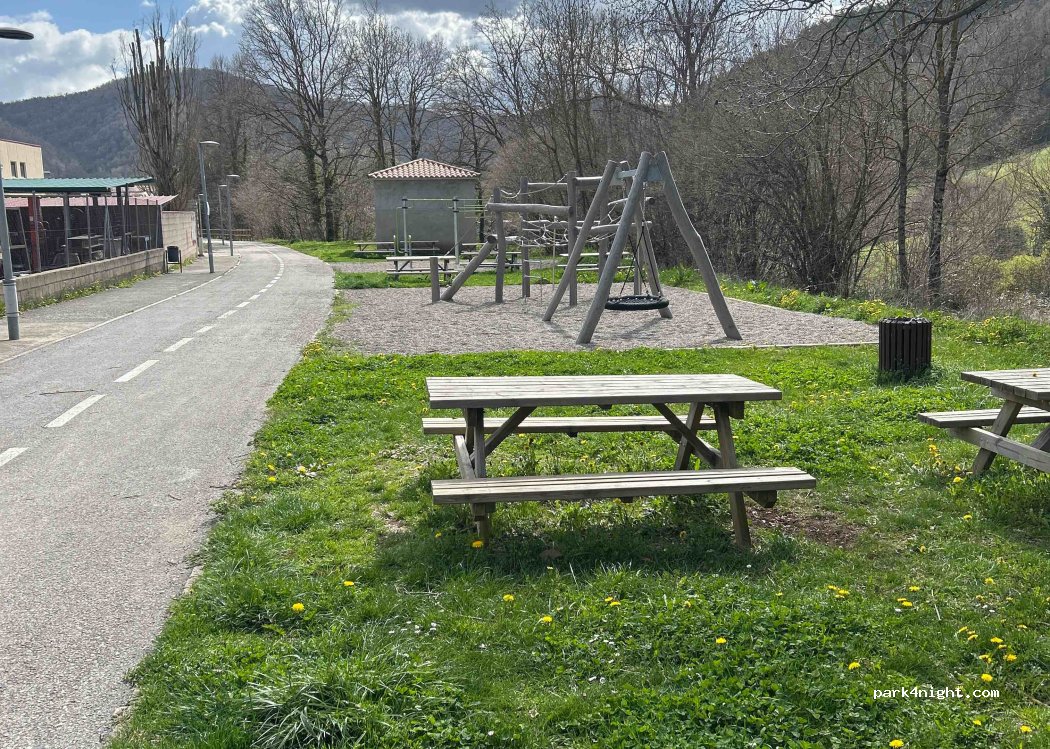 Endroit calme pour manger, 11 tables publiques en bois, aire de jeux pour enfants, fontaine à eau (même si elle ne fonctionnait pas quand j'y étais) et toilettes publiques gratuites pendant la journée avec inscription sur le site de la mairie, piste cyclable et jolie promenade le long de la rivière