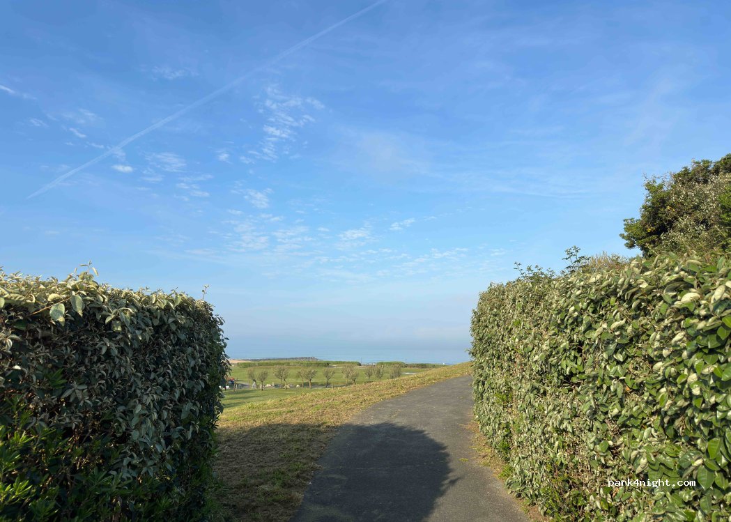 Pas fan des aires sur bitume, mais concrètement c’est moins cher que le prix d’un stationnement pour une journée à la plage. Bien arriver tôt pour choisir une place adéquate. Nous avons pu avoir de l’ombre contre une haie et de l’intimité. L’accès direct à la plage est un vrai plus.