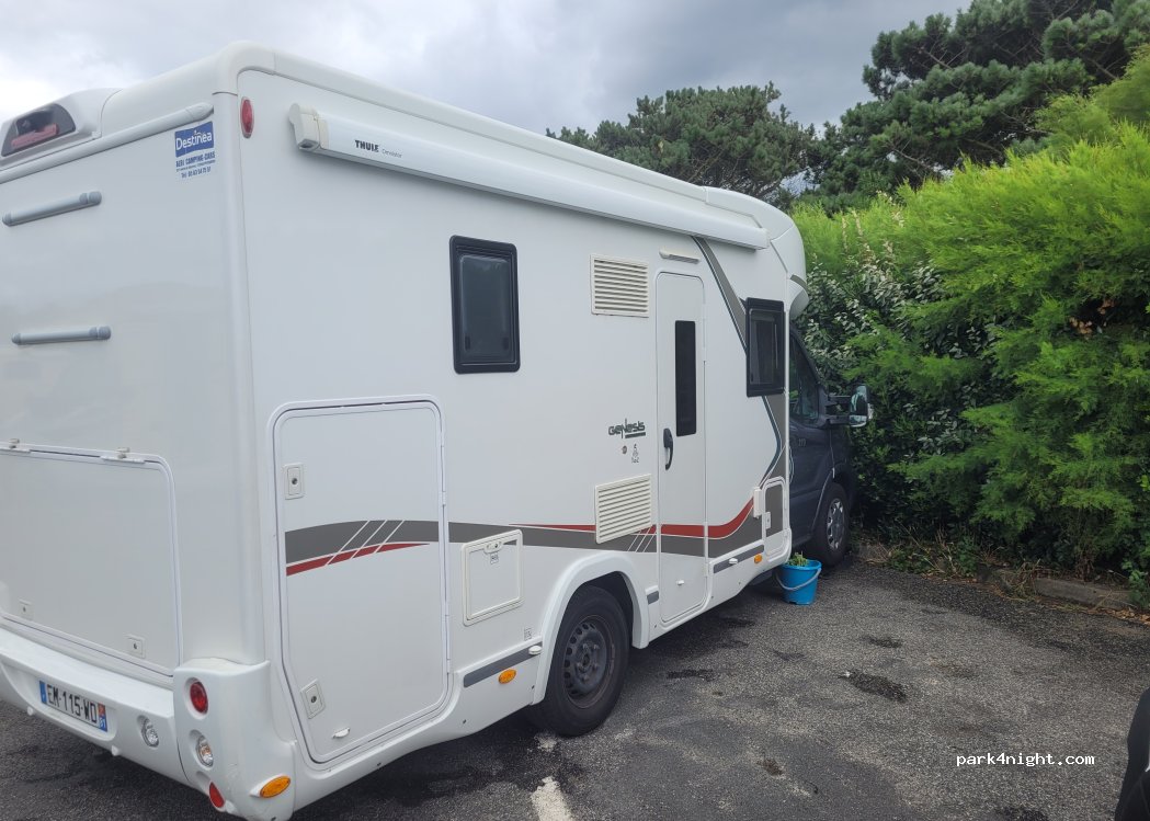 L’emplacement est top, proche de l’océan et de pistes cyclables. Très belle plage en contrebas. Le tarif est correct pour la saison, sinon c’est camping. Par contre, certains usagers sont sans gêne : s’installent sur 2 emplacements en ouvrant leur store comme au camping, d’autres se douchent au robinet d’eau potable, sans compter ceux qui n’ont pas de WC et font leurs besoin le long de la haie. C’est bien dommage car l’endroit est idéal…