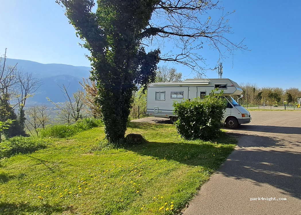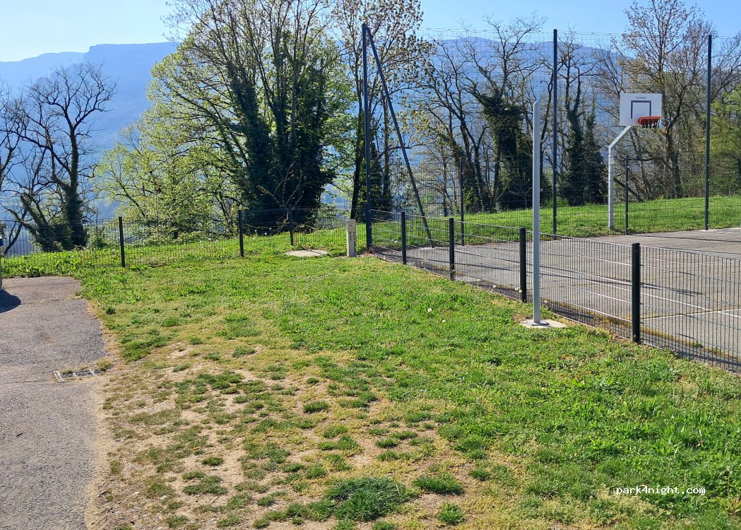 Emplacement pour une pause ou une nuit avec eau et jeux en hauteur de route départementale.