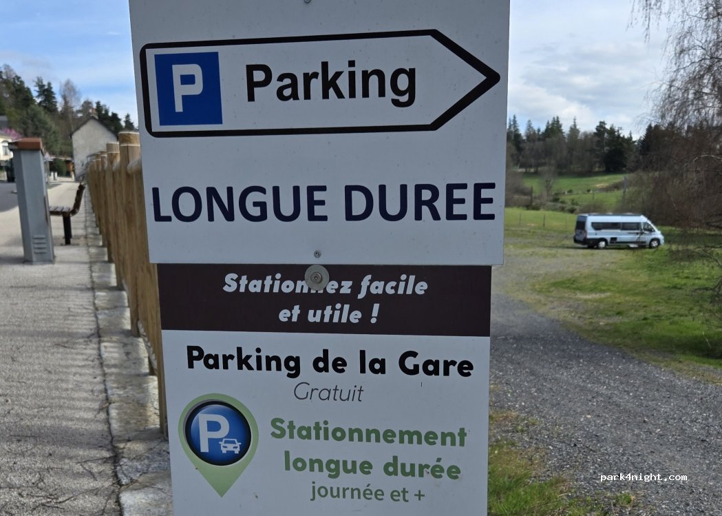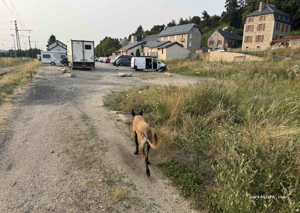 In addition to the parking lot that the Aumont Aubrac town hall has provided for camper vans on the heights above the town center, it has just opened a large unpaved parking lot near the train station. It is not a parking lot reserved for camper vans, but it is designed for long-term stays (so you can spend the night there without any problem) and there are quite a few spaces. There is a railway line nearby, but very few trains pass through. This can be useful for parking and visiting the beautiful village or for spending the night when the other parking lot is full.