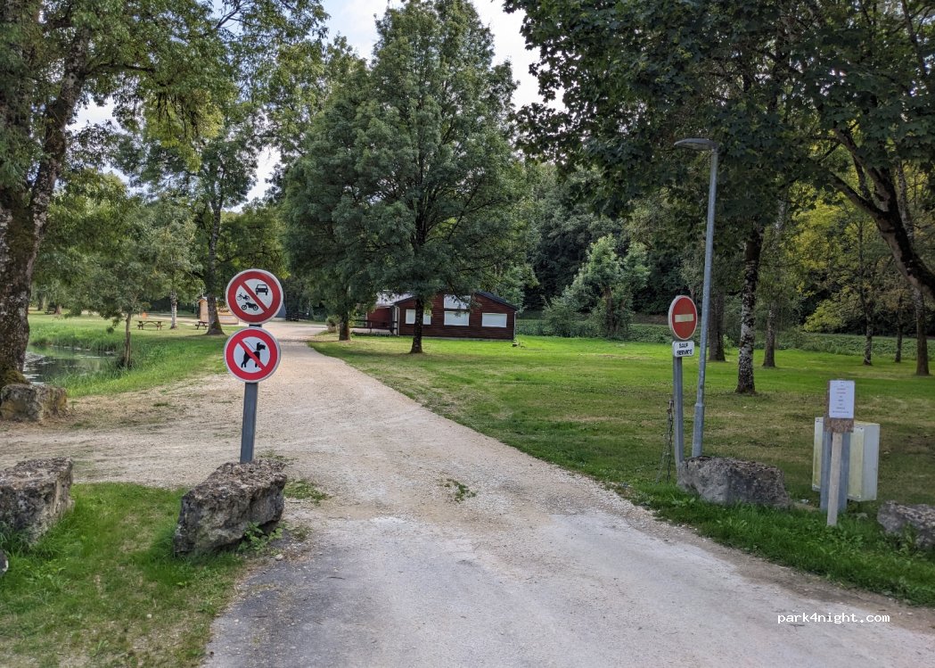 parking , sympa , juste avant la base de loisirs , mais sa penche un peu , une nuit sur place , calme peu de réseau internet