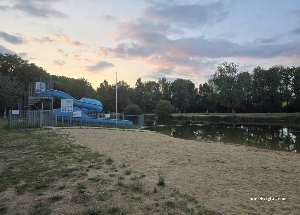 stationnement a l'ombre très agréable avec ces fortes chaleurs estivales. étang agréable. toboggan en bonus pour les enfants. les jeux au top pour les enfants ( tyrolienne, toile d'araignée, tapé fesse, tourniquet....). eau potable a disposition et douche de la plage. (froide). poubelle et tri a disposition.