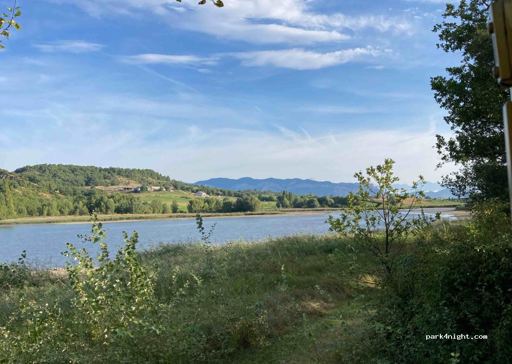 Pequeño parking de gravilla al borde del lago de Mison. Tranquilo. Leve inclinacion. Zona verde, avistamiento de aves.