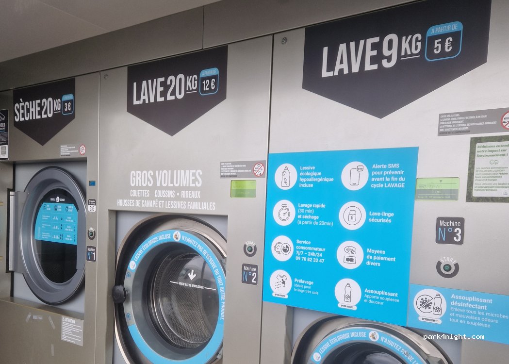 Laverie libre-service avec machine à laver et sèche-linge. À partir de 5€. Bars et restaurants juste à côté pour patienter...