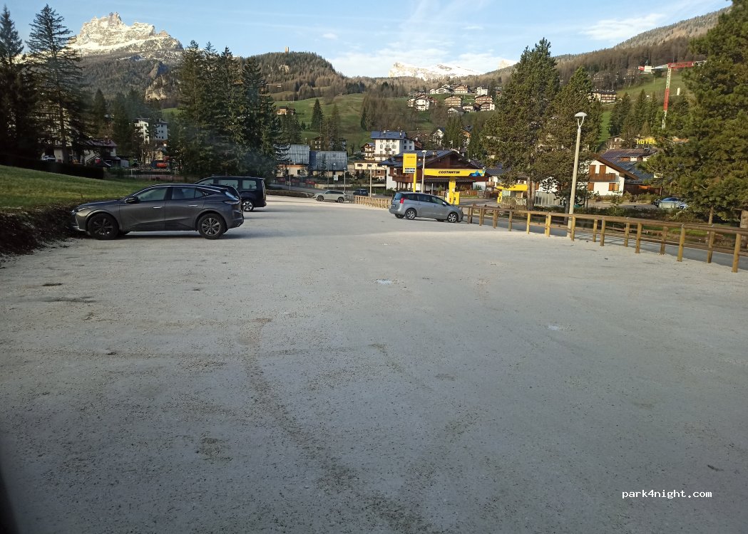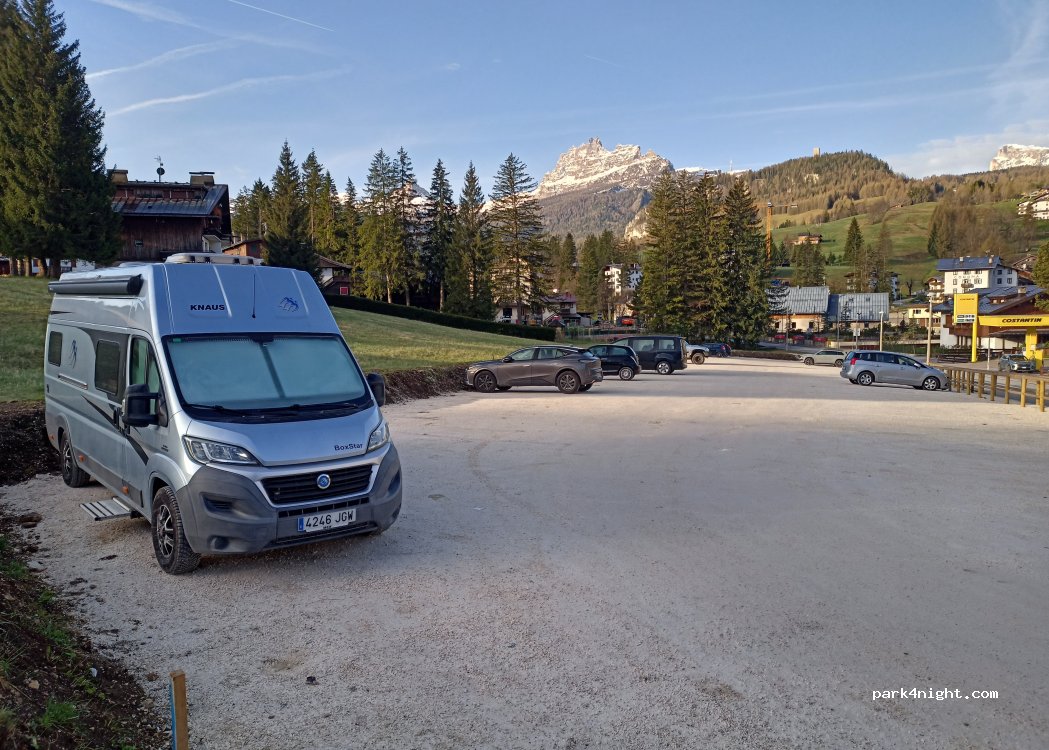 En frente de la gasolinera y con mucho movimiento. Es perfecto para visitar Cortina (a 500m la Oficina de turismo). Al mediodía está lleno, pero puedes esperar y se acaba quedando algún hueco libre, hacia media tarde (primeros de Julio) es fácil aparcar. No es llano, pero vimos muchas furgos y AC calzadas y la policía no multó.
