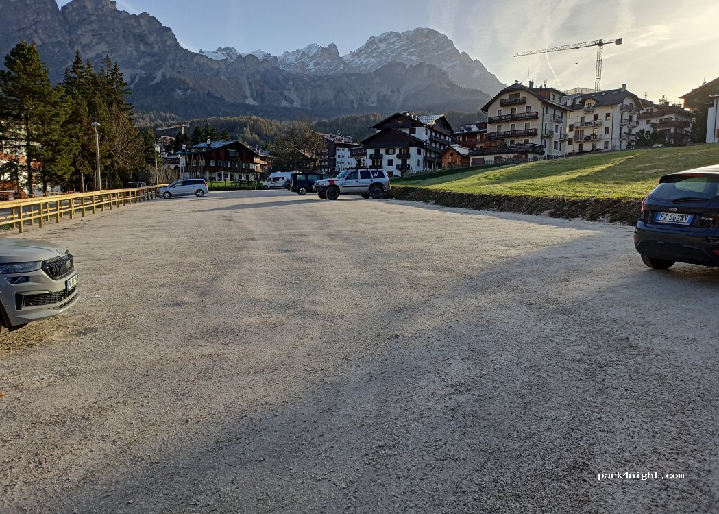 We used this carpark to visit Cortina. There is a 2.2m height limit, but we got under fine in our T5. We didn't stop overnight, but no signs to say you can't. It was full when we arrived but we waited 5 minutes and a spot came free. Free to park.