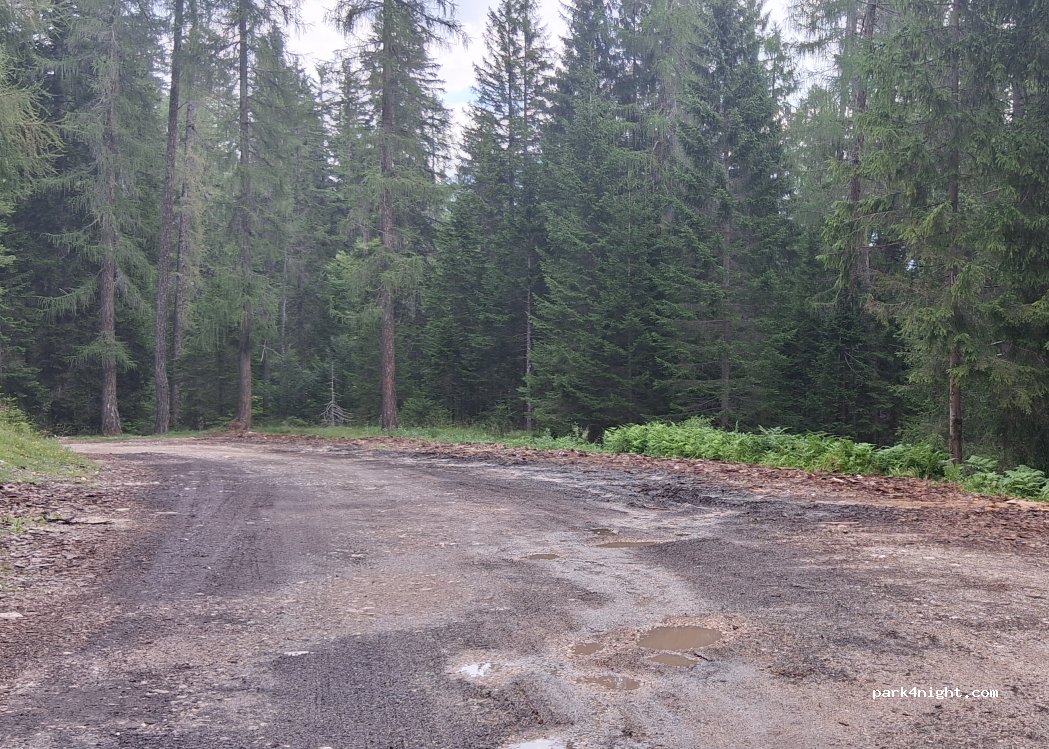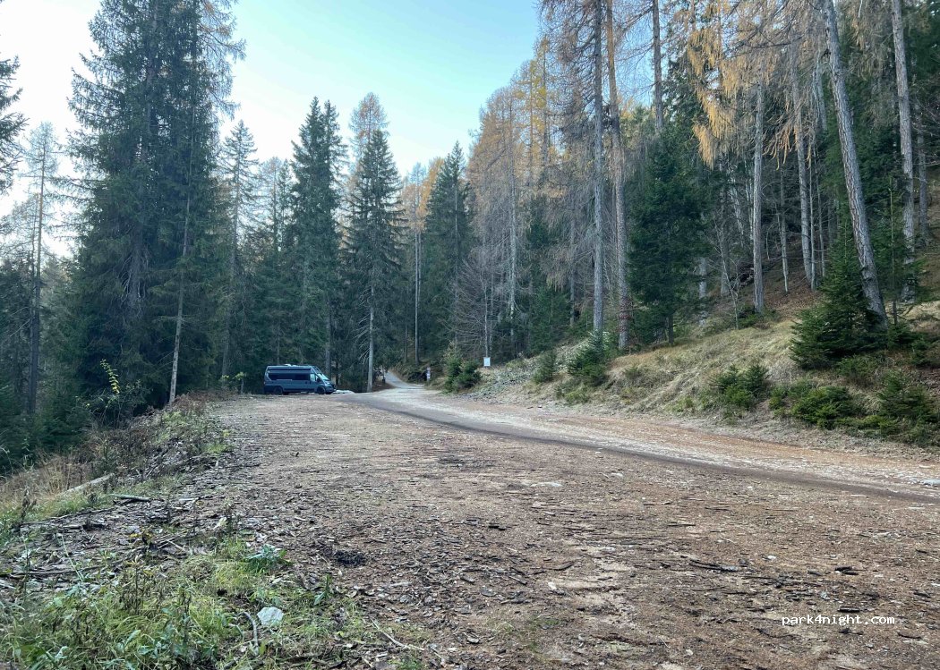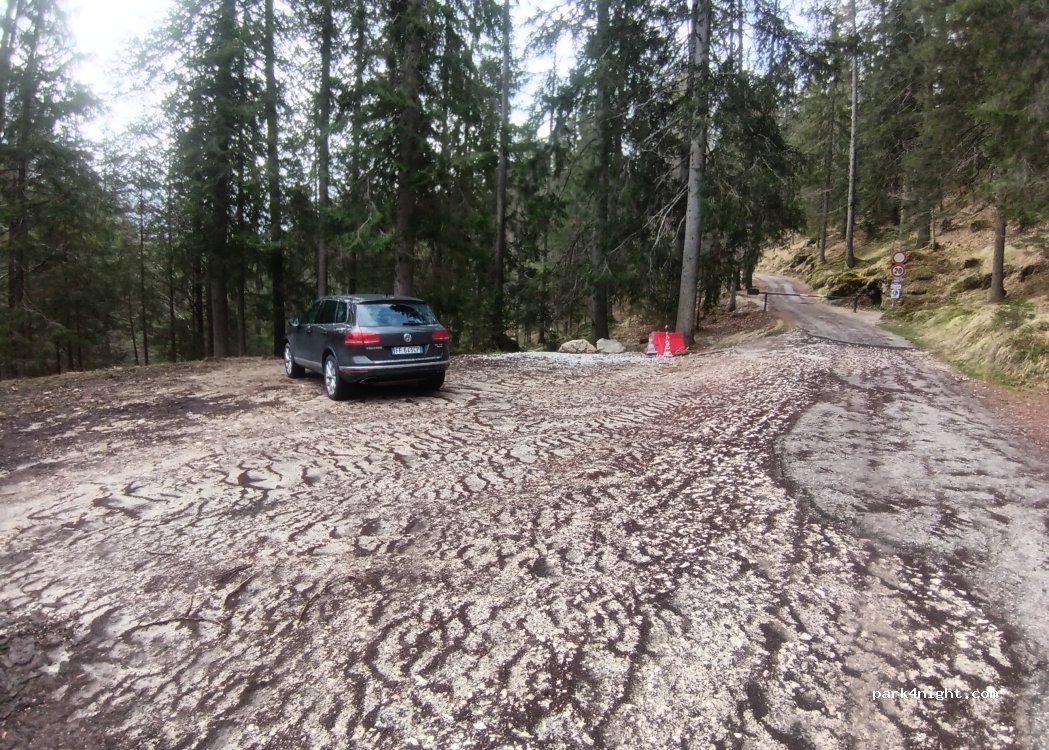 Antes de la barrera de Malga Federa. Bastante llano, sin señales de prohibición. Solo furgonetas, camino accidentado para campistas.