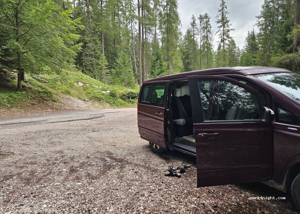 Before the barrier for Malga Federa. Fairly level, no prohibition sign. Only vans, bumpy road for campers.