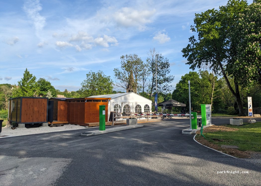 emplacement spacieux stabilisé. Cadre agréable avec snack a l'entrée.Proche du centre tres agreable commerce café... 20 min à pied attention ça grimpe. 15 euros pour 24H