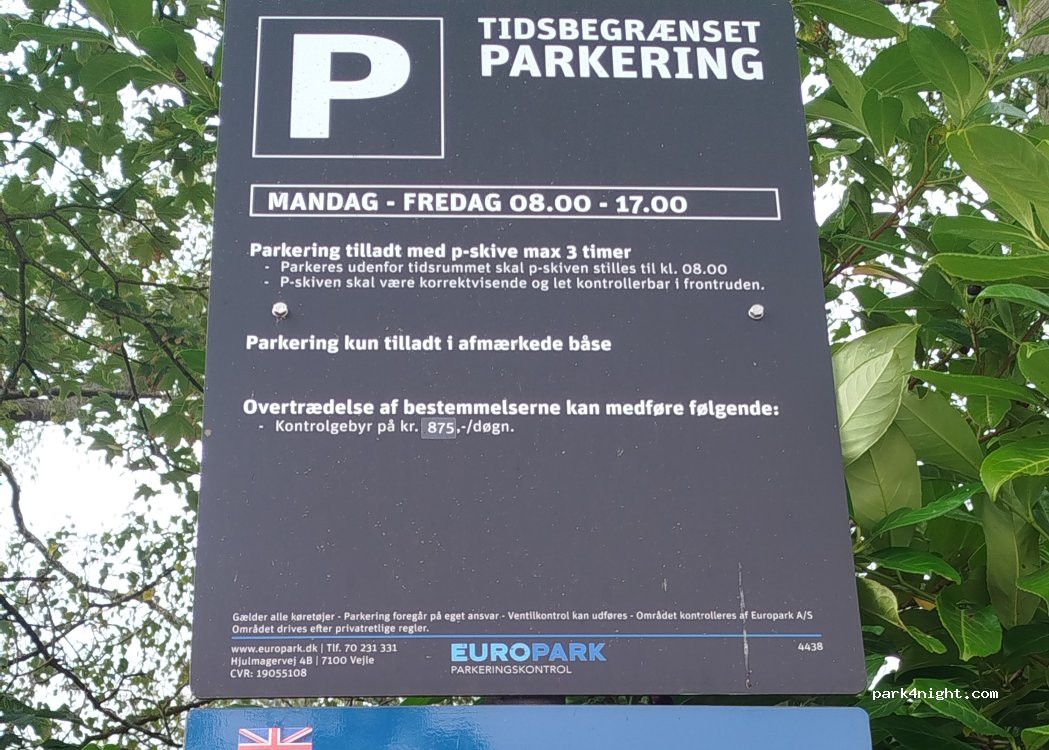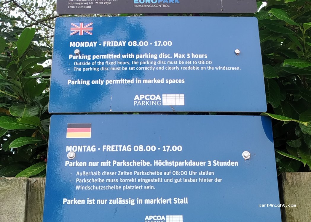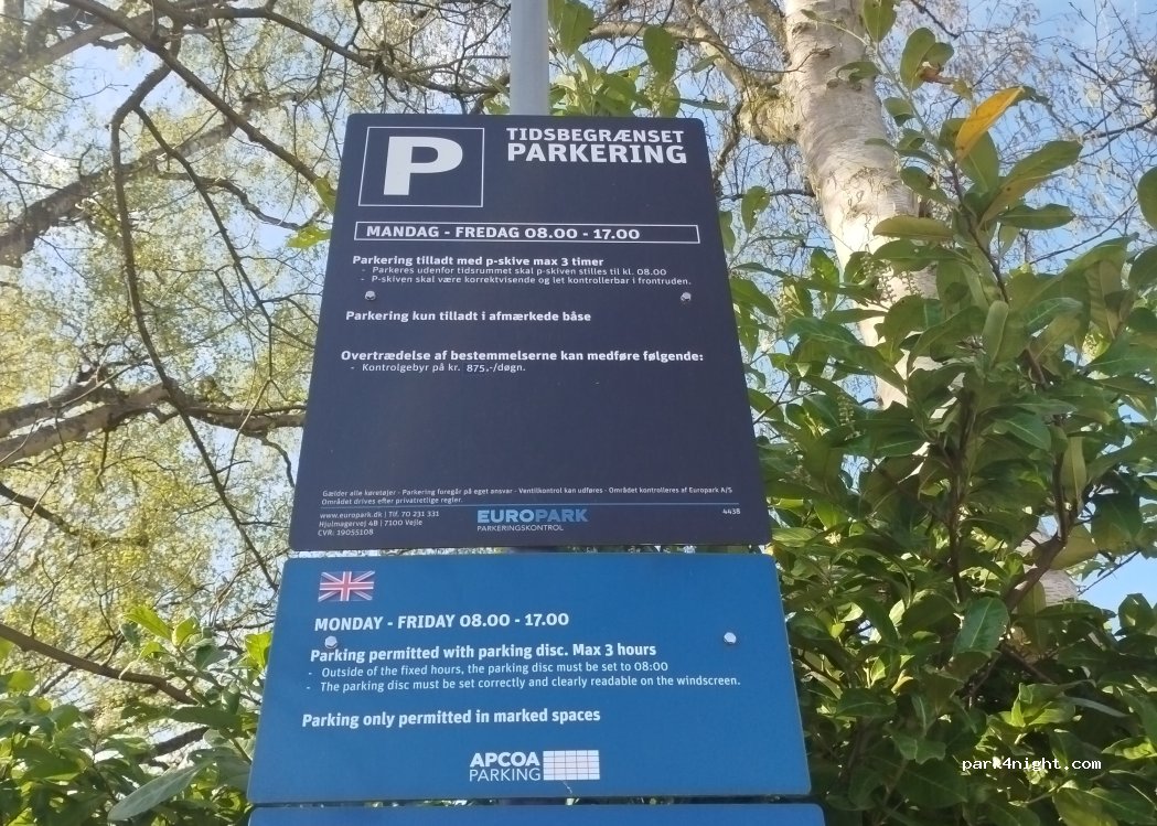 The first 6 rows, all days of the week, 08:00-17:00, 3 hours on parking disc. the back part of the space, Monday-Friday 08:00-17:00 3 hours on parking disc. free parking, from Friday 18:00 to Monday 8:00 Read the signs. possibility to use the toilet, at Føtex during opening hours. 150 m to the harbor and 200 m to the center