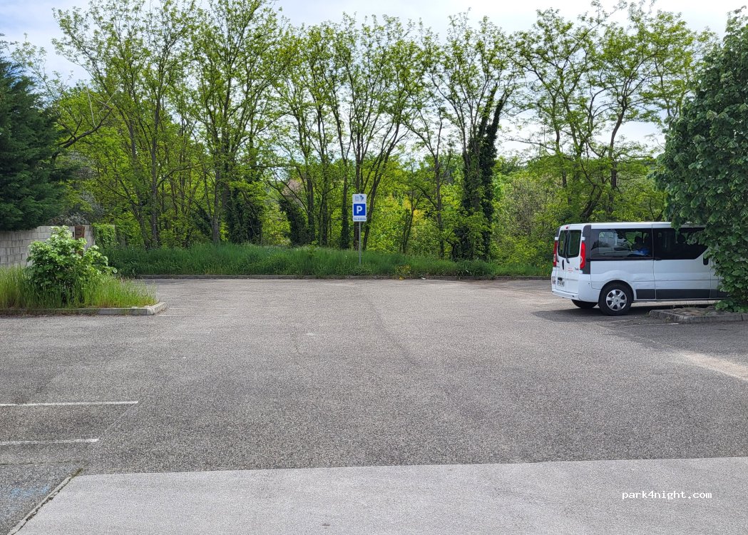 Parking plat sans interdiction ni limite de hauteur, dans un environnement calme et avec des tables de pique nique.