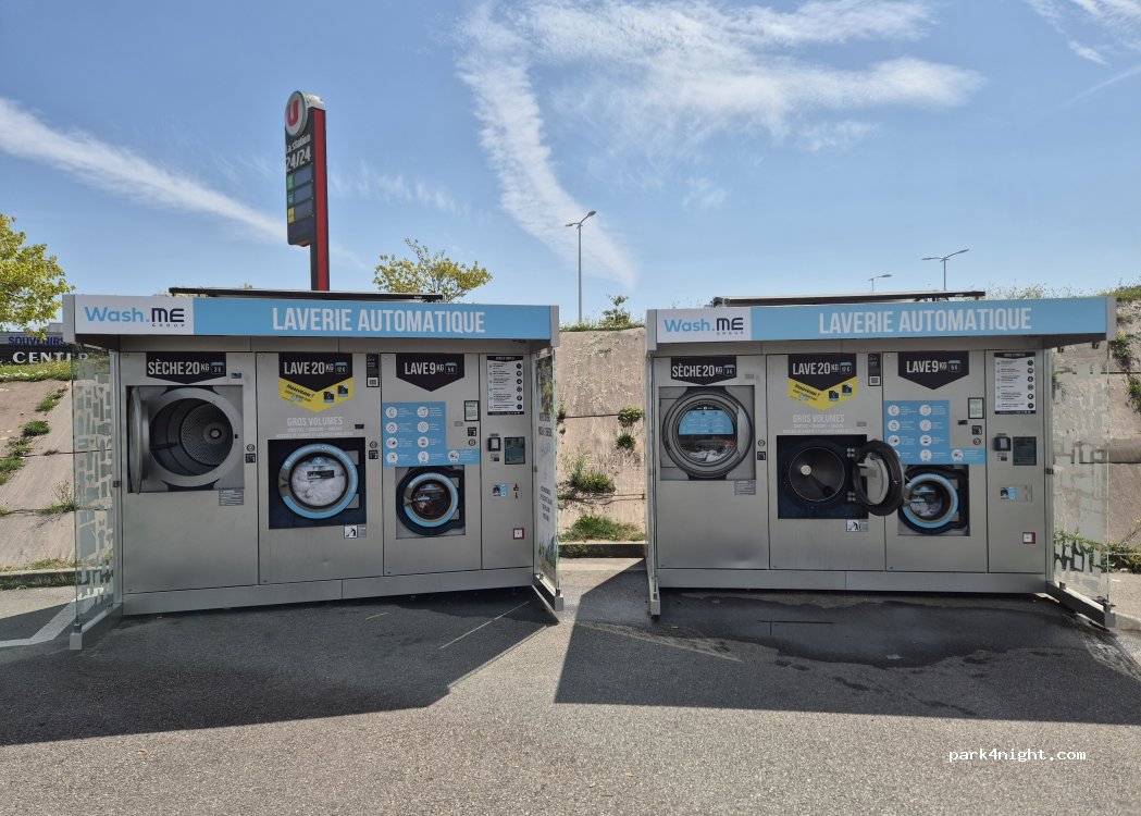 Merci à la direction de super U. Parking accueillant une cinquantaine de camping cars, Nuit toujours aussi calme, entendons un peu la circulation sur la voie express, rien de gênant.A partir de 10 h l emplacement pour la nuit devient un parking de supermarché, faut ouvrir les rideaux isothermes. Sur place 2 plates-formes de vidange, remplissage eau 2 €. Carburant, gaz, aire de lavage, laverie.