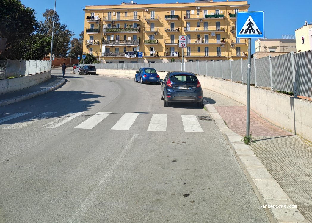 Parcheggio strisce bianche lungo una strada tranquilla, in pendenza. Dietro l'angolo il porticciolo e il centro storico.
