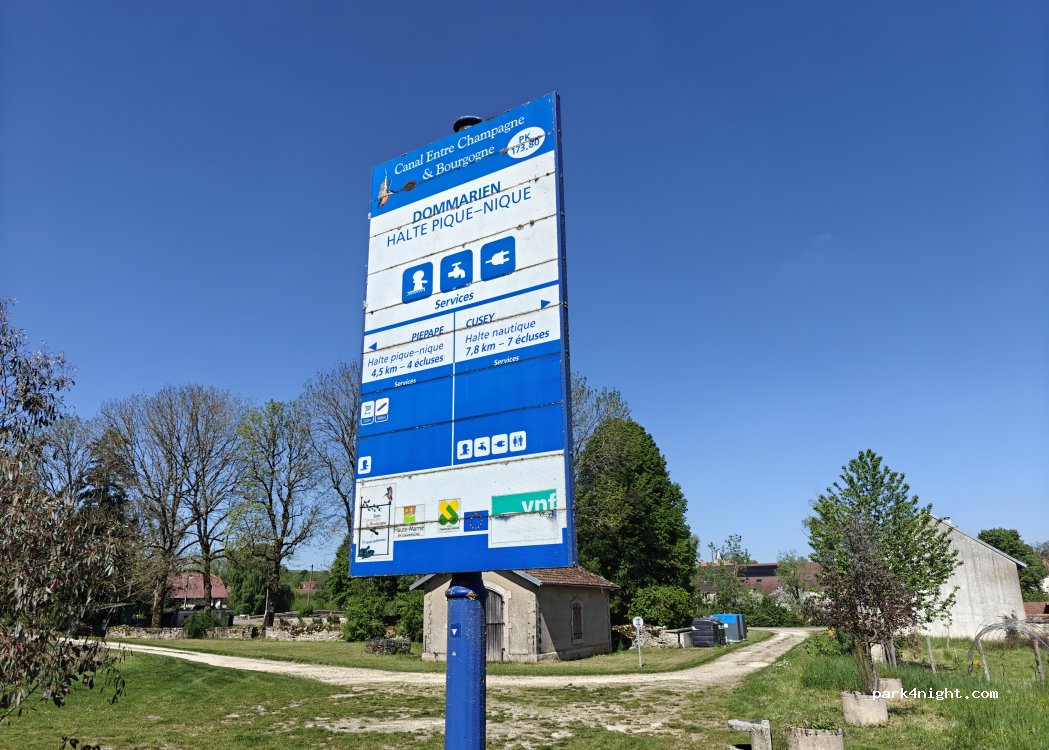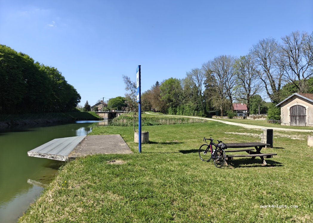 Une aire de pique-nique très calme avec trois tables de pique-nique et une poubelle. Idéal pour une nuitée le long du pittoresque canal entre Champagne et Bourgogne.
