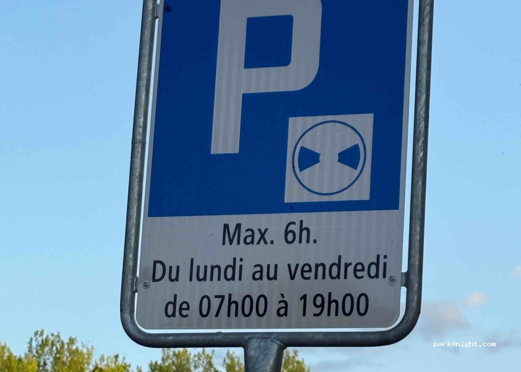 Very quiet sandy parking lot near a small river and trails for skating and biking. Free parking is allowed for a maximum of six hours from 7 a.m. to 7 p.m. with a blue disc, Monday through Friday. Free parking at night and on weekends. The terrain is practically flat, and about three campers stayed overnight. The town, a playground, and a few bars are nearby.