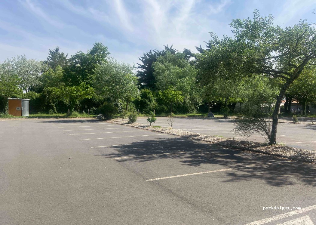 Parking between a small park and a tennis club. About twenty parking spaces, dry toilets are available, and trash cans are located at the park entrance. Height restriction: 1.90 m. Very quiet!