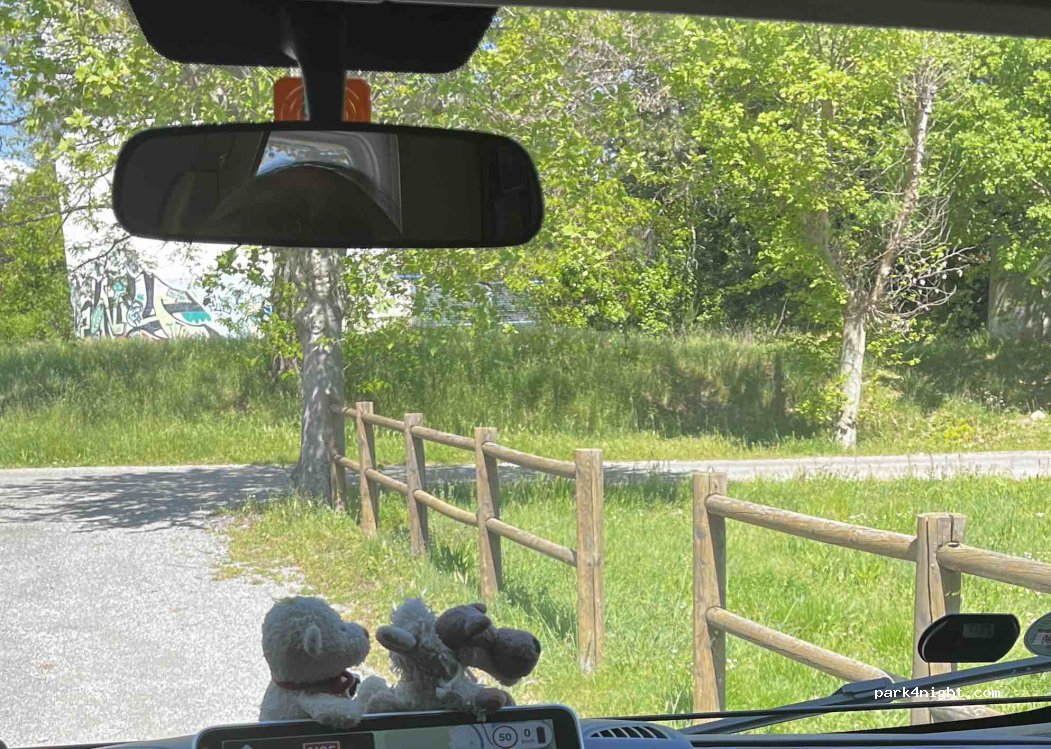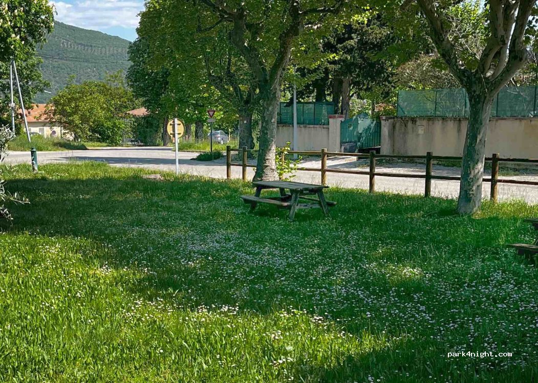 Petite aire de pique-nique au village avec tables et bancs en bois sous les arbres. C'est un bon endroit pour s'arrêter et faire une pause avec votre camping-car.