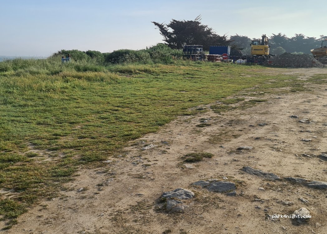Le parking en terre battue est normalement limité à 2 m, mais le 1er mai, le bar était ouvert depuis longtemps. Un chantier l'utilise actuellement comme parking pour ses engins. Très calme.