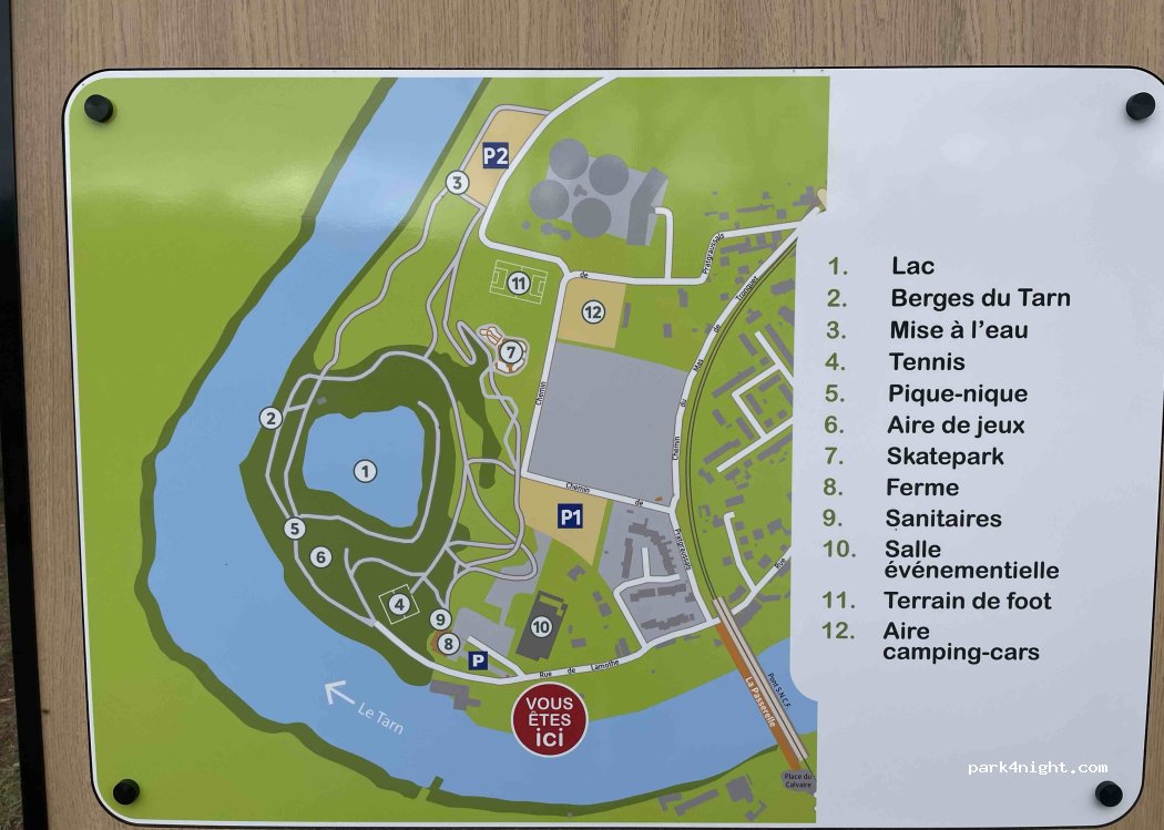 Aparcamiento en el ayuntamiento de un pueblo, no lejos del Tarn, a 15 minutos a pie del centro de la ciudad de Albi. Con grandes y hermosos pinos paraguas, y muy tranquilo entre semana. En las noches de fiesta en la sala contigua, uno puede imaginarse que no es en absoluto un lugar adecuado. No hay prohibición de pernoctar allí, no hay bar, pero es un lugar a respetar si no quieres que lo prohíban. Parque cercano.