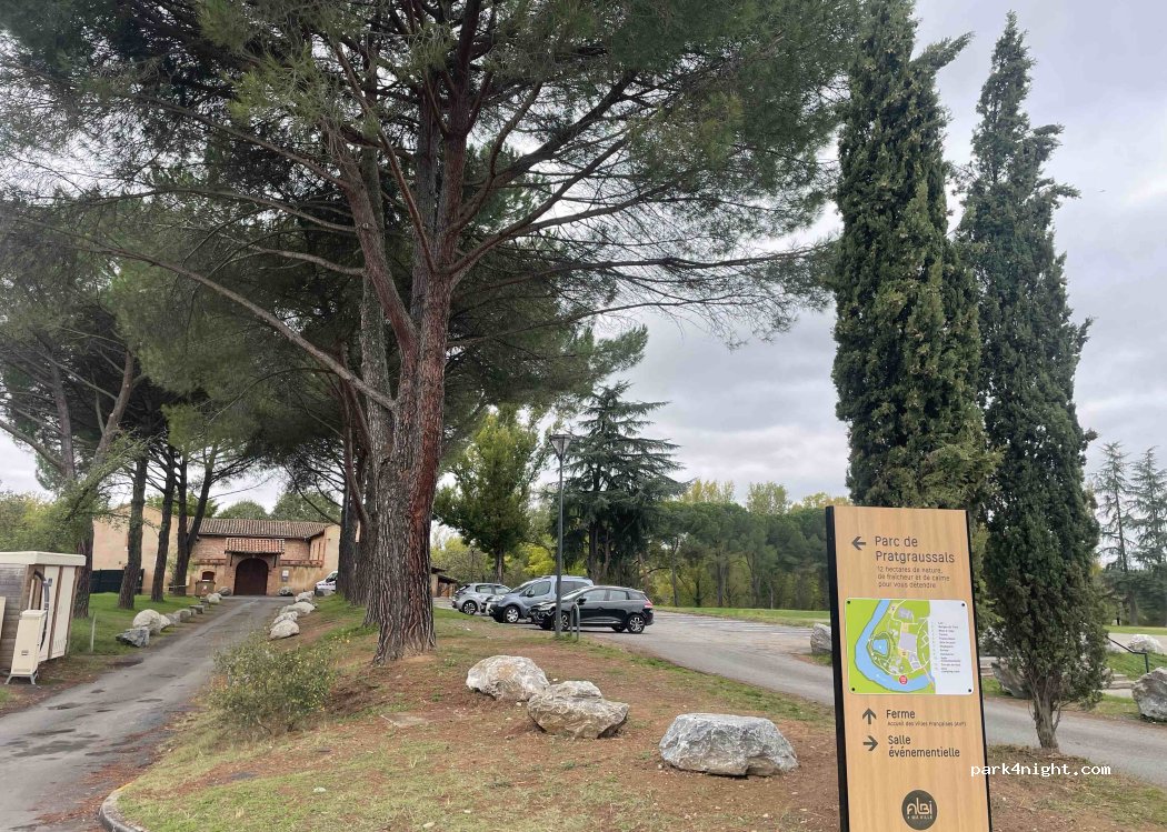 Parking d’une salle des fêtes, non loin du Tarn, à 15 minutes à pied du centre-ville d’Albi. Avec de grands beaux pins parasols, et très tranquille en semaine. Les soirs de fête dans la salle voisine, on peut imaginer que ce n’est pas du tout approprié comme lieu. Pas d’interdiction d’y passer la nuit, pas de barre, mais lieu à respecter si on ne veut pas qu’il soit interdit. Parc à proximité.
