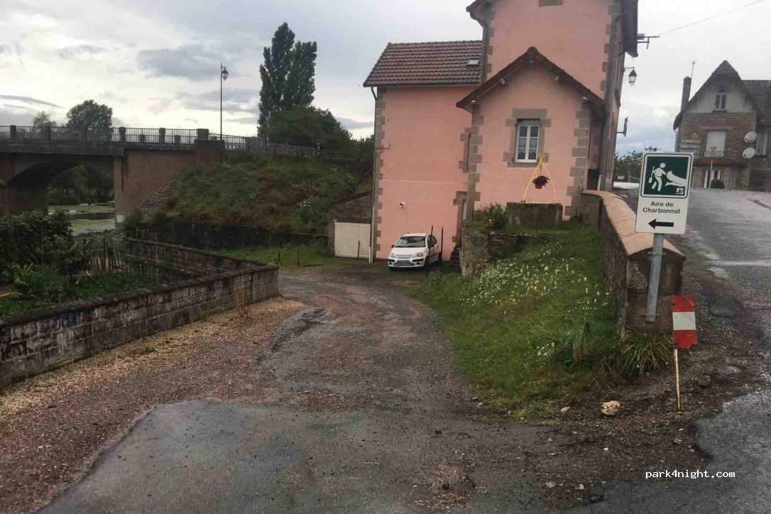 Petit parking face à la mairie. Table de pique-nique à l’ombre de tilleul et petit chêne. Des toilettes très propre. La rivière est à 2 minutes à pieds. Très calme pour la nuit.