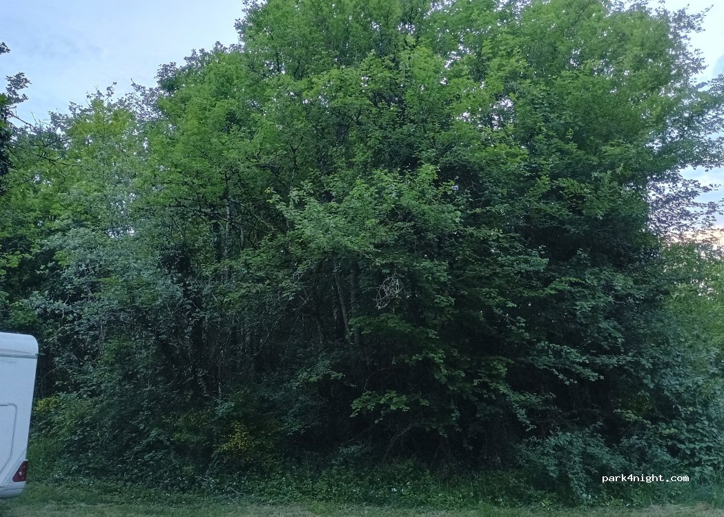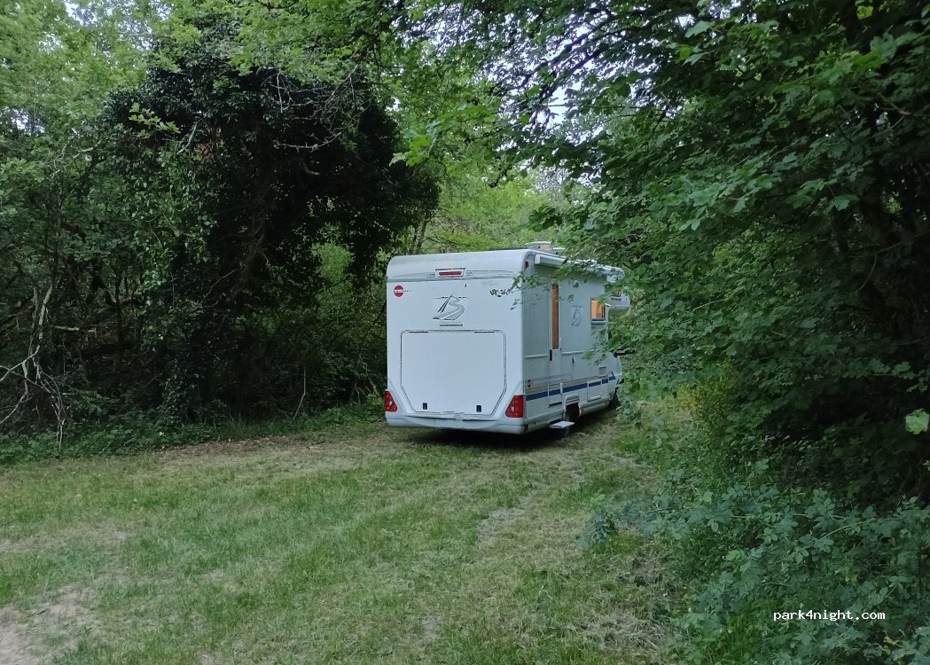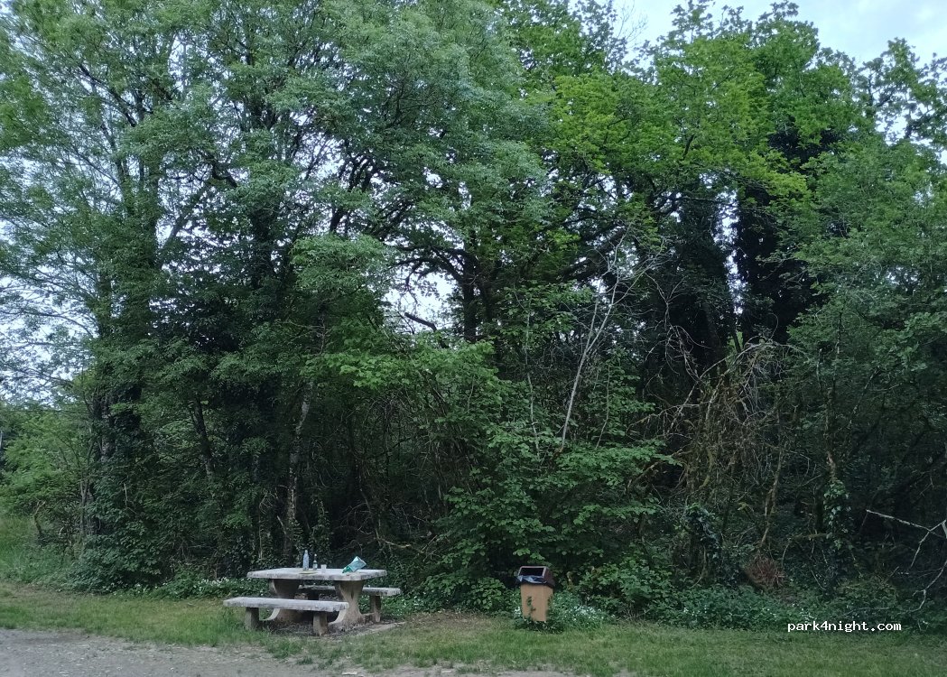 Aire de pique-nique avec table et poubelle, avec un renfoncement dans la forêt pour garer un camping car. En bordure d'une petite route où nous n'avons eu pour l'instant aucun passage.