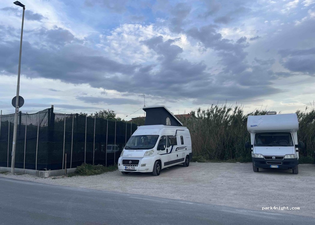 Parkplatz auf unbefestigter Straße, sehr genutzt am Ende der Strandpromenade von Fano, herrlicher Ort, schöne Aussicht, kein Service, einziger Minuspunkt: Die Kunden des Restaurants nebenan parken ruhig davor und verhindern so eine mögliche Ausfahrt. Hier kann man sich während des Abendessens nicht mehr bewegen