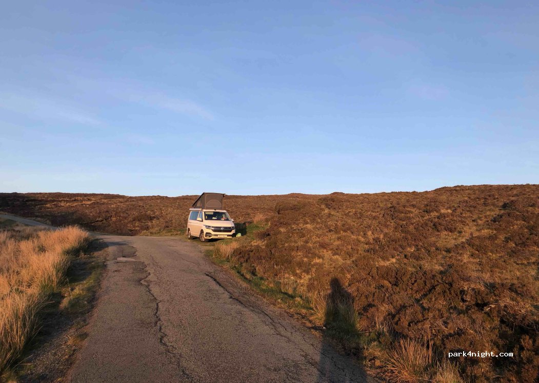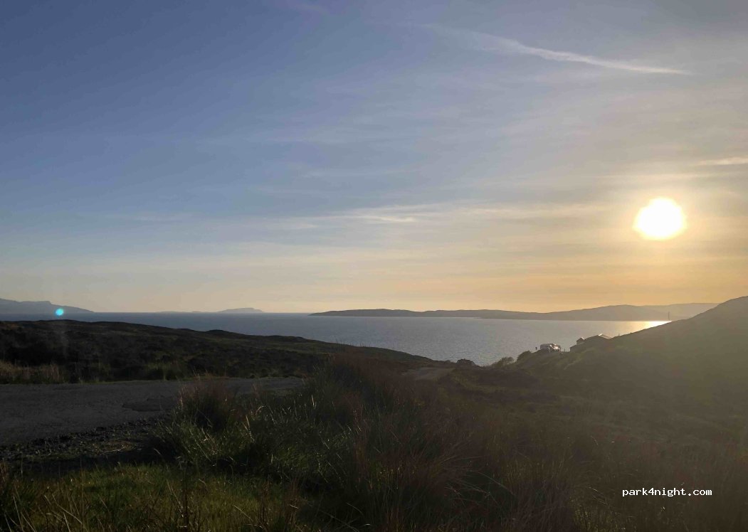 Nice spot on a passing place with a view over Elgol and the sea. River nearby and 200m from a community center with toilets and facilities for van. Not totally flat but ok