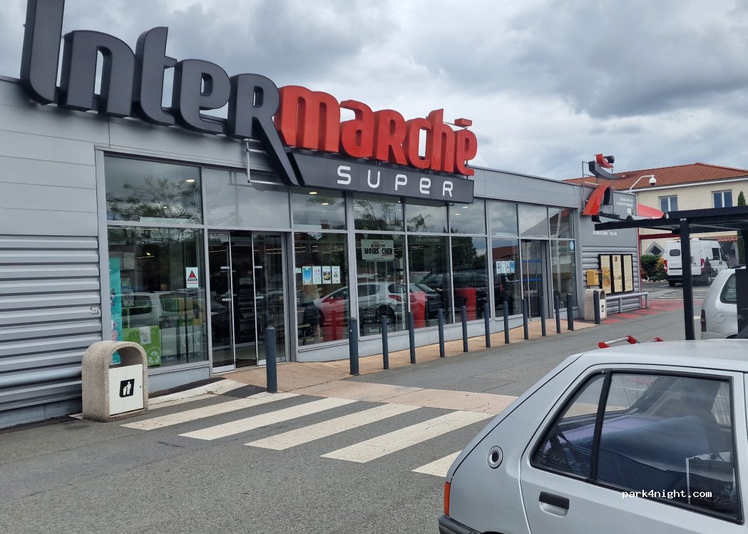 Intermarché con gasolinera y lavandería, cambio de bombonas de gas, buena panadería, estrecho, no se admiten autocaravanas grandes.