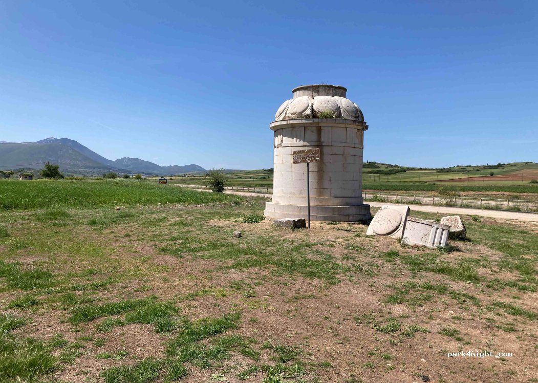 Junto al monumento a la gloria de la Batalla de Leuctra, a la que contribuyó enormemente el Batallón Sagrado de Tebas. Aparcamiento en la intersección de varias carreteras. Ideal para picnics. Muy poca sombra. Históricamente muy interesante.