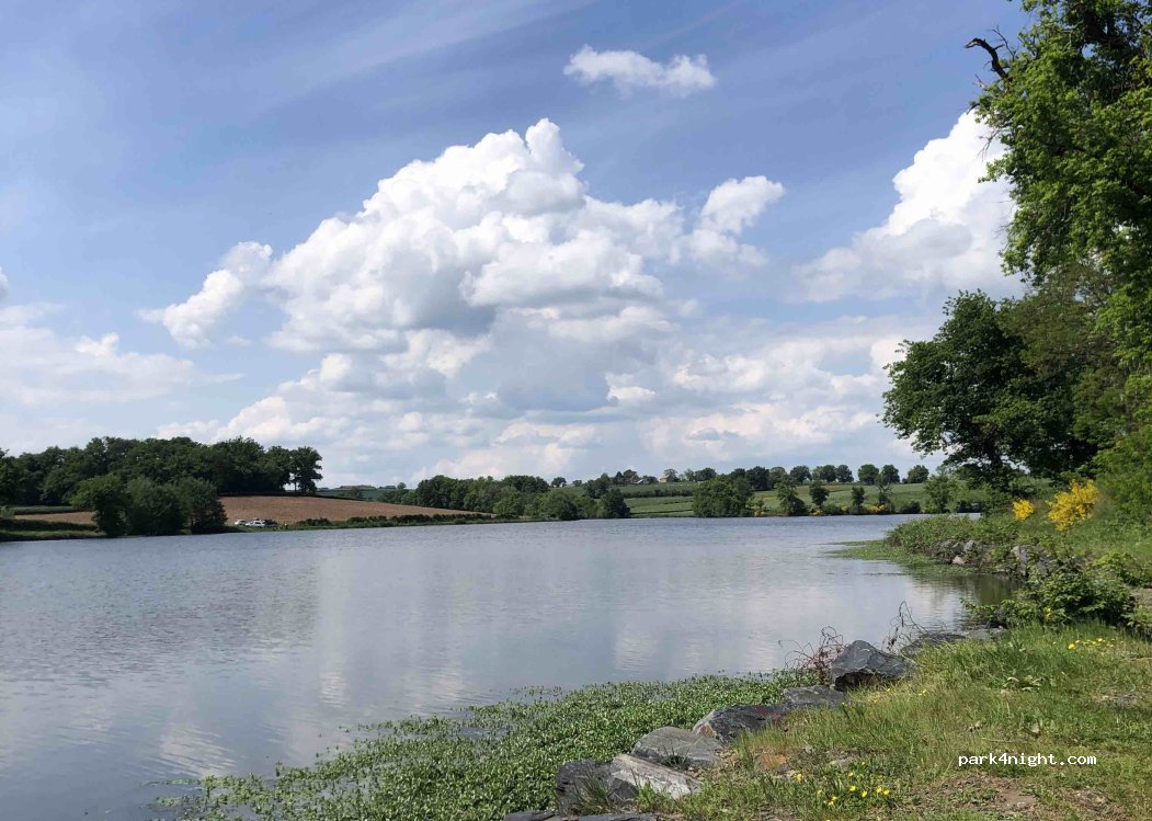 Bord d’étang, grande bande plate pour pique-niquer ou bien passer la nuit. Possibilité de garer deux véhicules en bord de route, peu passante.