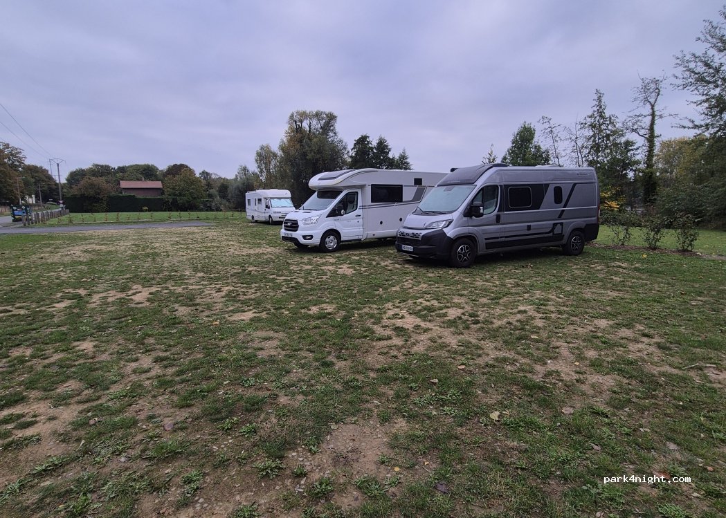 Aire de stationnement totalement refaite, sol plat, entourée de haies naissantes il est bon de se garer en épi et non de face comme nous 'avons vu avec les collègues allemands ou hollandais, c'est une question de respect vis à vis des riverains et gens qui partagent avec nous l'endroit. Calme et sécurisé par la route qui y passe et les habitations.