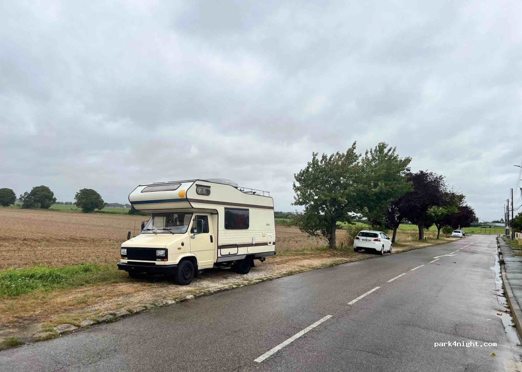 ruhiger Platz in einem kleinen Ort am Straßenrand,mit Blick auf den beleuchteten Eiffelturm in der Ferne! 400m bis zum nächsten Bäcker. Wir hatten eine entspannte Nacht.