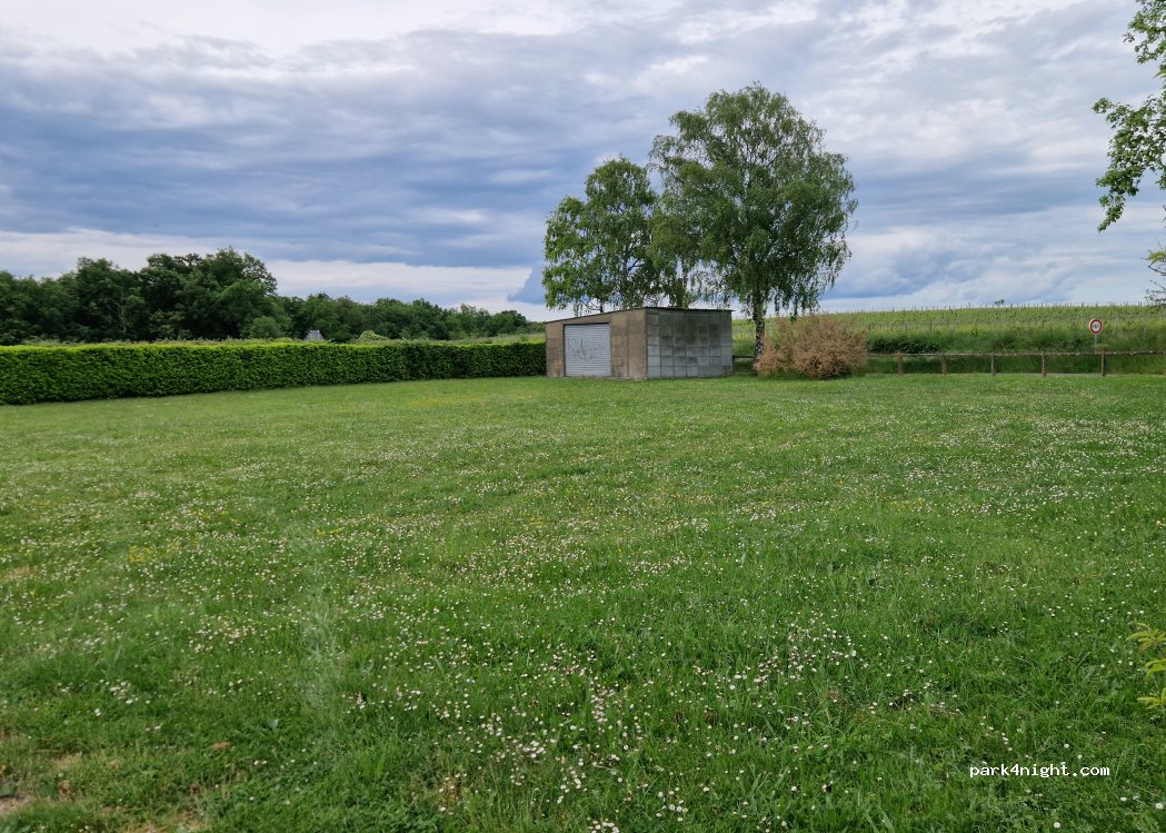 Grassy parking lot at the exit of the village of Brezé.