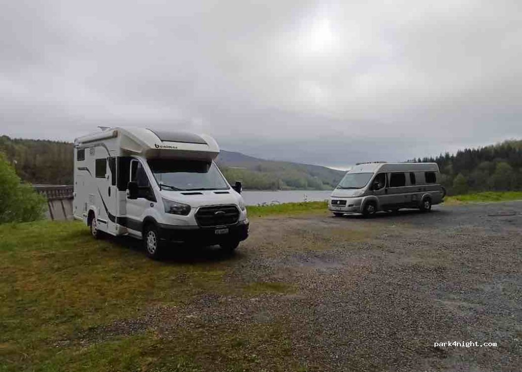 Parking juste a côté du barrage . Sans interdiction. Nous y avons dormi une nuit . Très peu de circulation . Belle vue sur le lac . Légèrement en pente